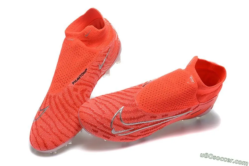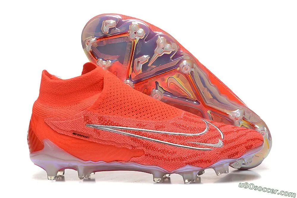 Nike Phantom GX Elite DF FG football boot for adults. Knit boot with sock, to be used on dry or wet natural grass pitches. High-end boots for control and precision players in Black-Volt-White-Blue Glow-Pink Blast color.
